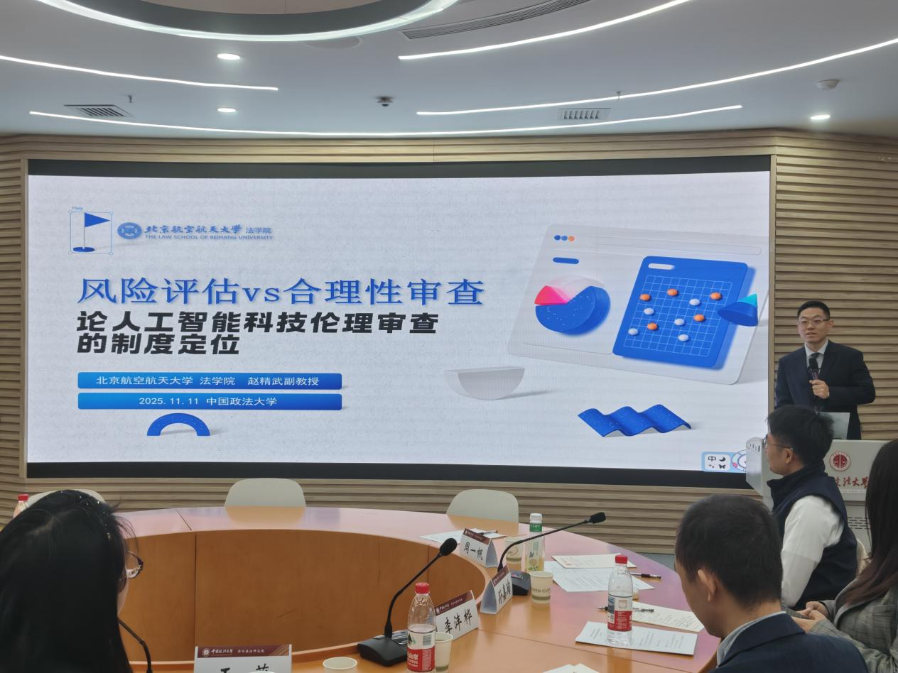 北京航空航天大学法学院院长助理赵精武教授以“人工智能发展的科技伦理审查:软硬法接口与责任框架”为题发言。他探讨了在人工智能广泛应用背景下,科技伦理审查制度面临的挑战,提出需要明确审查边界、嵌套标准化逻辑、完善审查委员会运行机制,并将成熟的伦理共识逐步转化为法律规范,以应对科技治理的涉外法治维度。