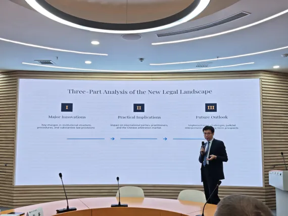 随后,乔焕然律师以“中国仲裁法的创新与未来”为题发表演讲。乔律师首先回顾了自1994年《仲裁法》颁布以来中国仲裁制度的发展历程,指出仲裁制度在中国法治现代化进程中发挥了重要作用。围绕新修订的《仲裁法》,他从“重大创新”“实际意义”与“未来展望”三个方面展开阐述。在“重大创新”部分,乔律师指出,新修订的《仲裁法》在体制结构、程序设计、仲裁机构去行政化、外国仲裁机构在华受案以及仲裁员义务与原则框架等方面均有显著突破。在“实际意义”部分,他强调,中国仲裁制度在保持自身特色的同时,正提升作为投资目的地的吸引力,展现出更强的制度灵活性,并提醒各方重视仲裁条款起草、机构转型及市场趋势。在“未来展望”部分,乔律师总结了2025年仲裁法改革的成果,指出渐进式改革中保留了中国特色,并介绍未来十年的分阶段发展计划,提出法律界应关注的行动要点及需牢记的五项重点。
