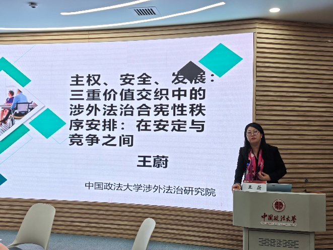 中国政法大学涉外法治研究院副院长王蔚教授以“主权、安全与发展:三重价值交织中的涉外法治合宪性秩序安排”为题,提出宪法不仅要保障国内法秩序的统一与稳定,也应引导涉外立法积极响应国际治理规则的变迁。
